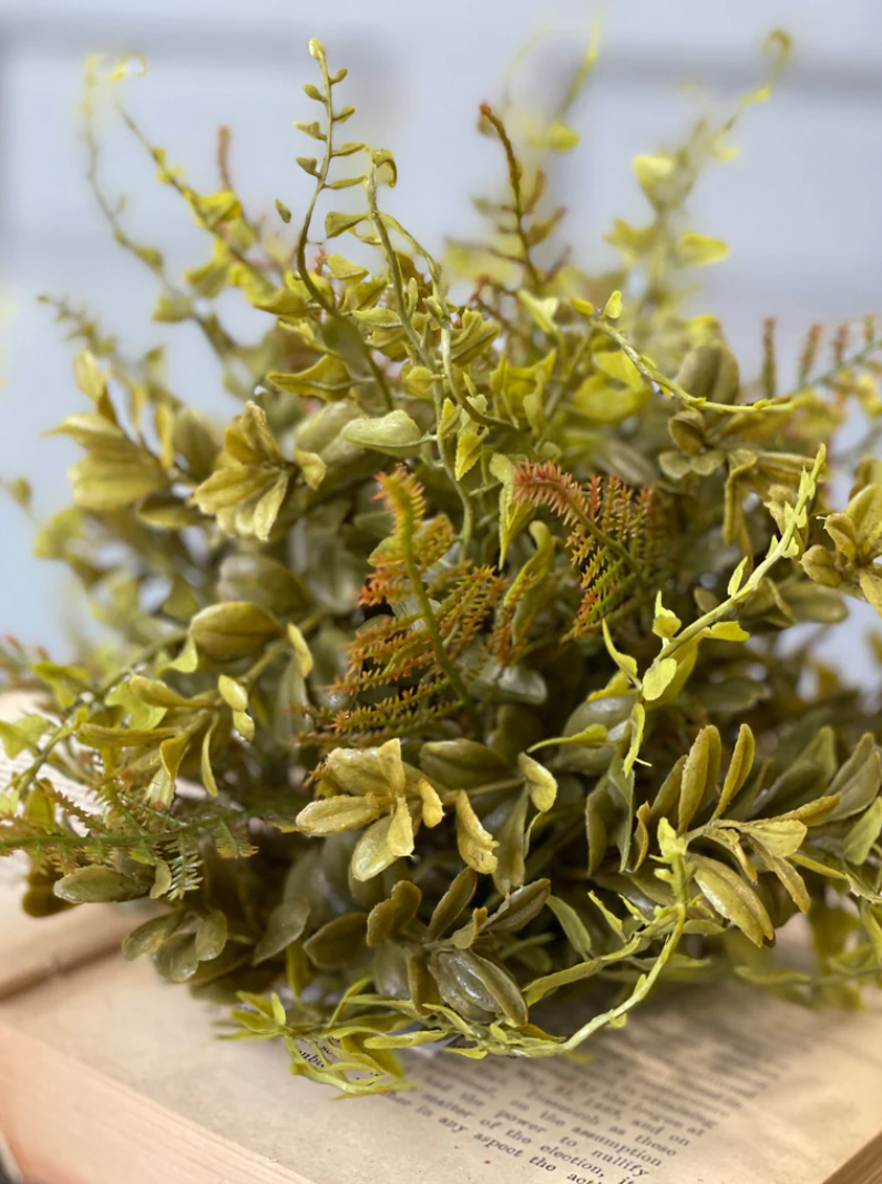 Trailing fern tendrils arc out from mixed greenery to create a natural and textural collection.