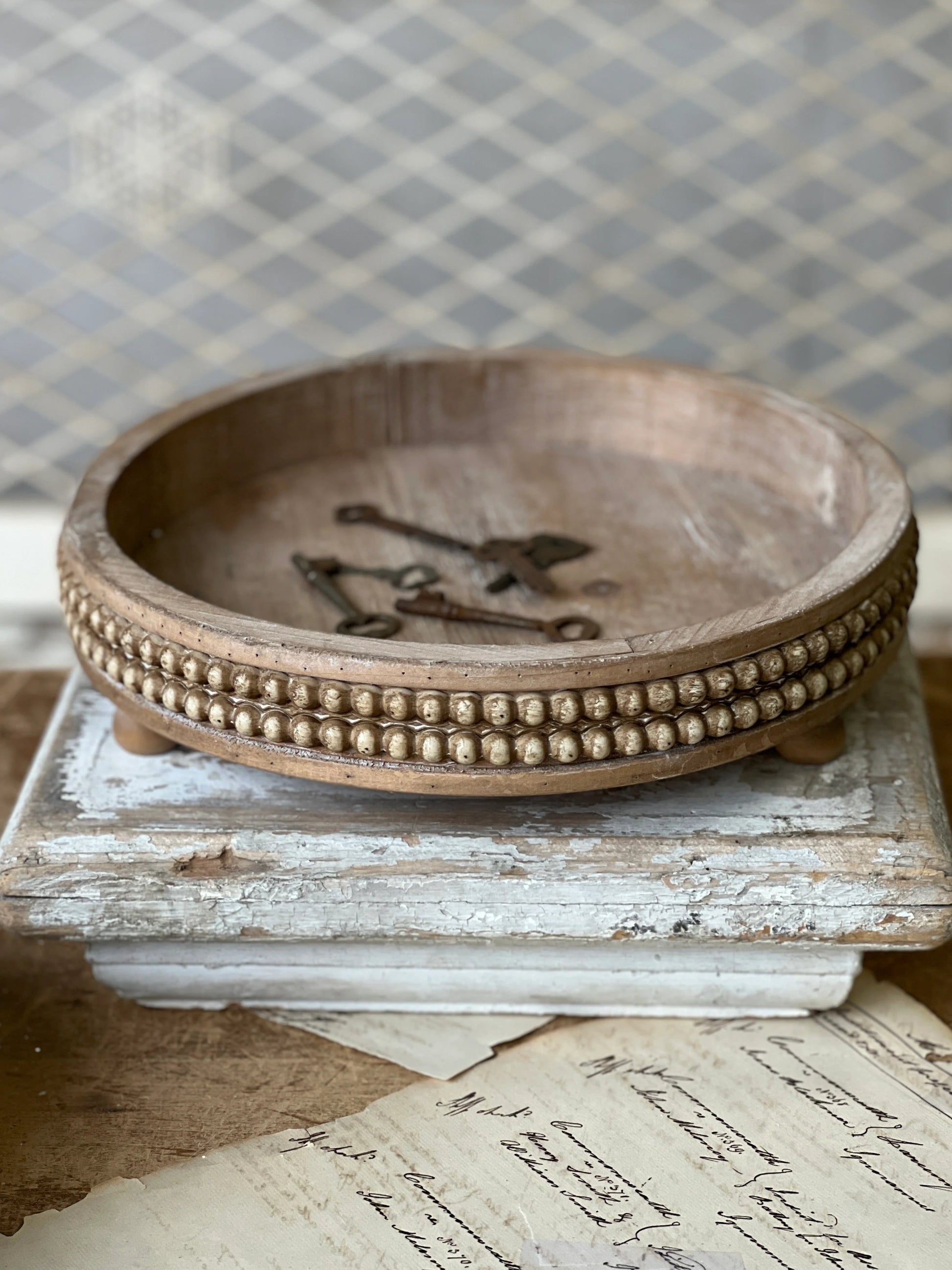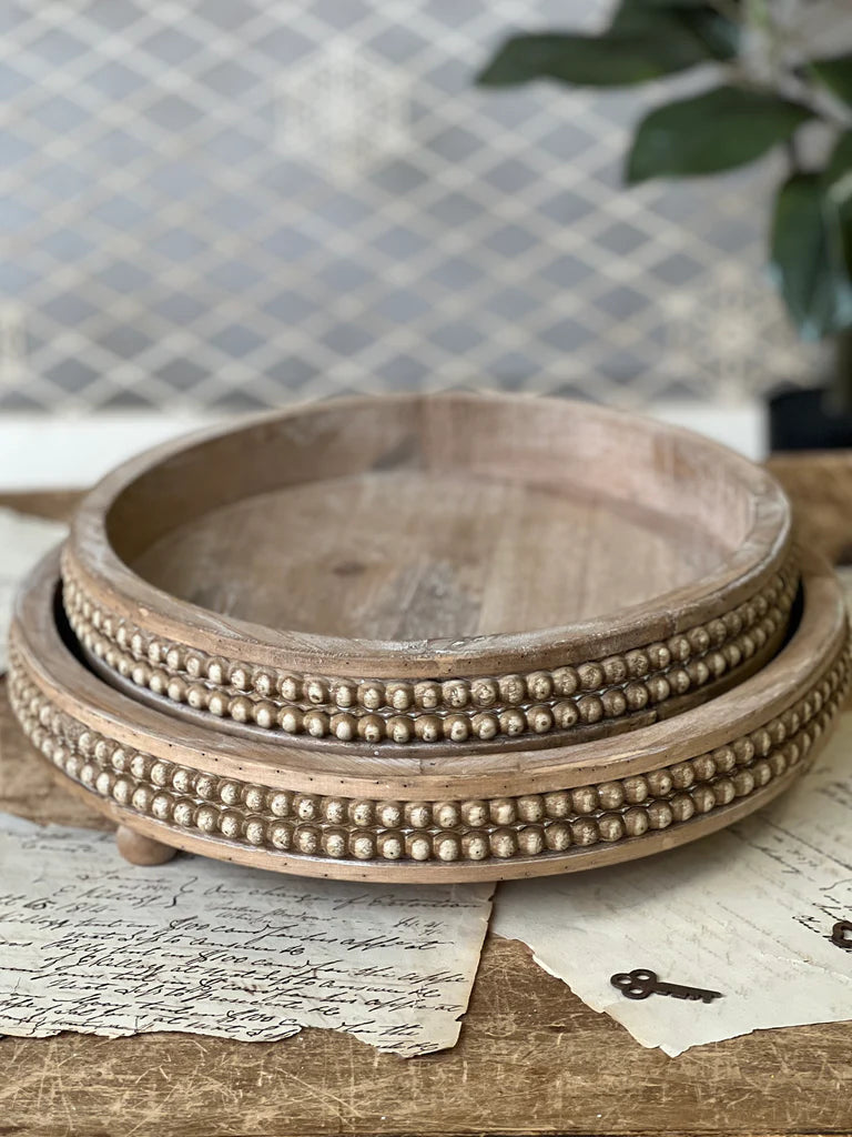 Footed round trays feature a double row of distressed beading. Wood has a very light whitewashed finish and natural imperfections. Lg 12.75" | Sm 11". Can be purchased as a set or individually.