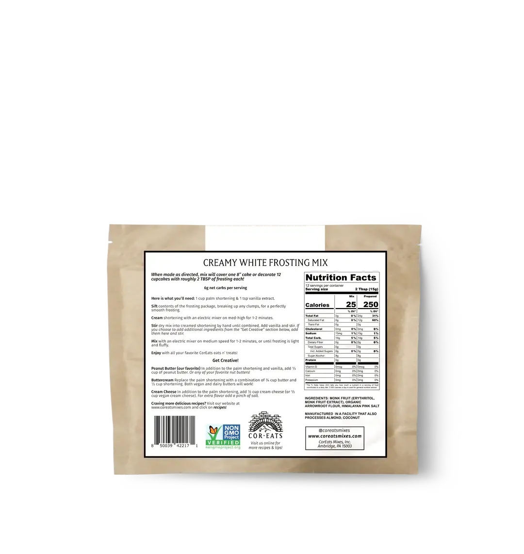 Your search for creamy, whipped to fluffy perfection, delicious frosting is over! Never free from the flavor you crave, only the unwholesome ingredients you don’t! CorEats Creamy White Frosting truly checks all the boxes: