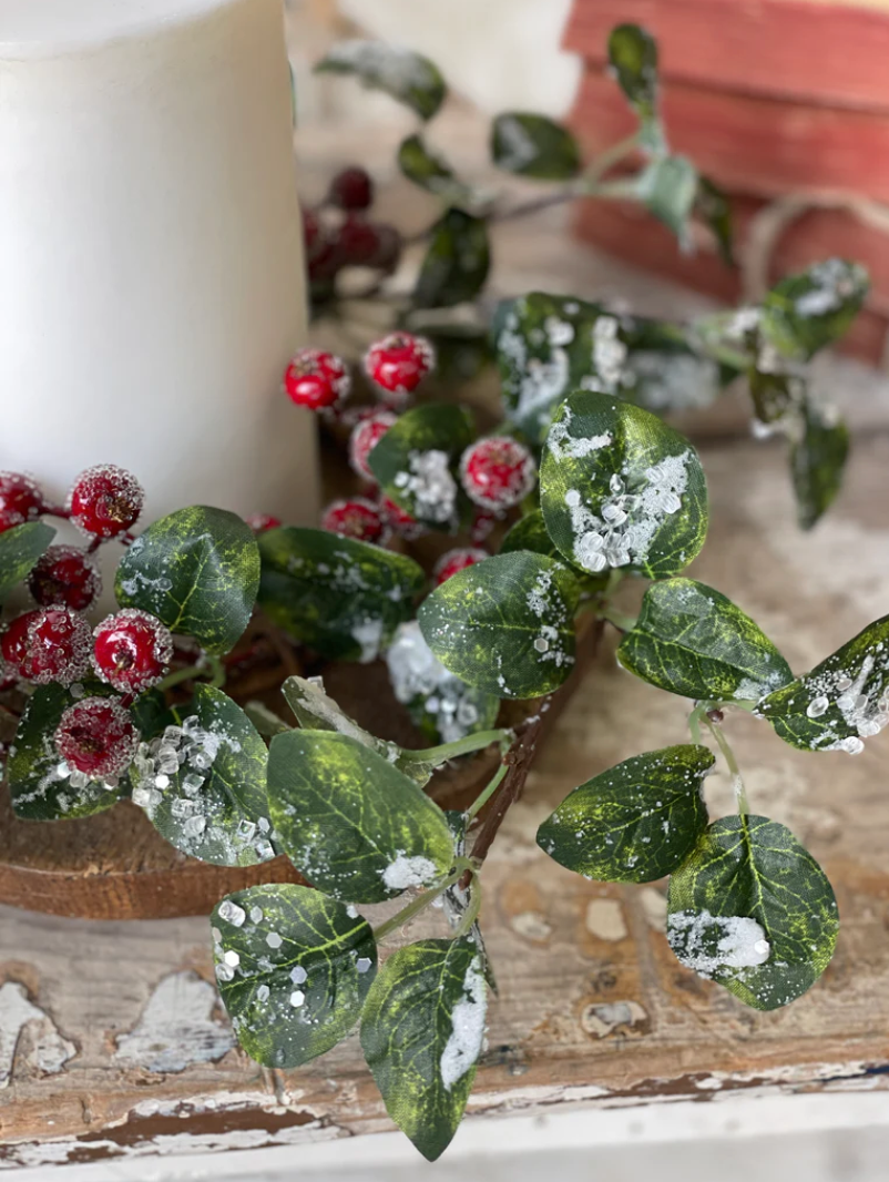A collection that celebrates the wonders of winter! Pretty green leaves that are a nice alternative to the typical pine and cedar are dotted with a snowy coating that is topped with ice crystals, light glitter, and beaded ice. The “icing” on the cake are bursts of red berries that set off the icy coating to perfection.