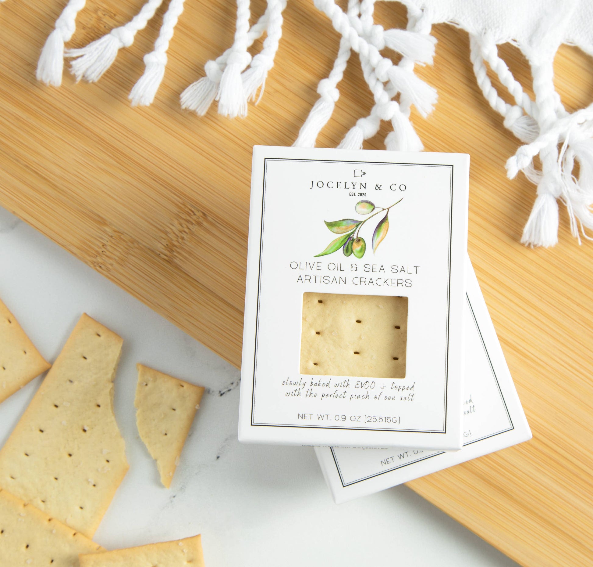 Our most popular cracker available in our signature luxe design box. These single serve olive oil and sea salt crackers are the perfect snack and versatile for any occasion or themed gift. The crackers are made with high-quality olive oil and sprinkled with just the right amount of sea salt to create a delicious and satisfying flavor. Enjoy them on their own or pair with other items for an elevated snacking experience.