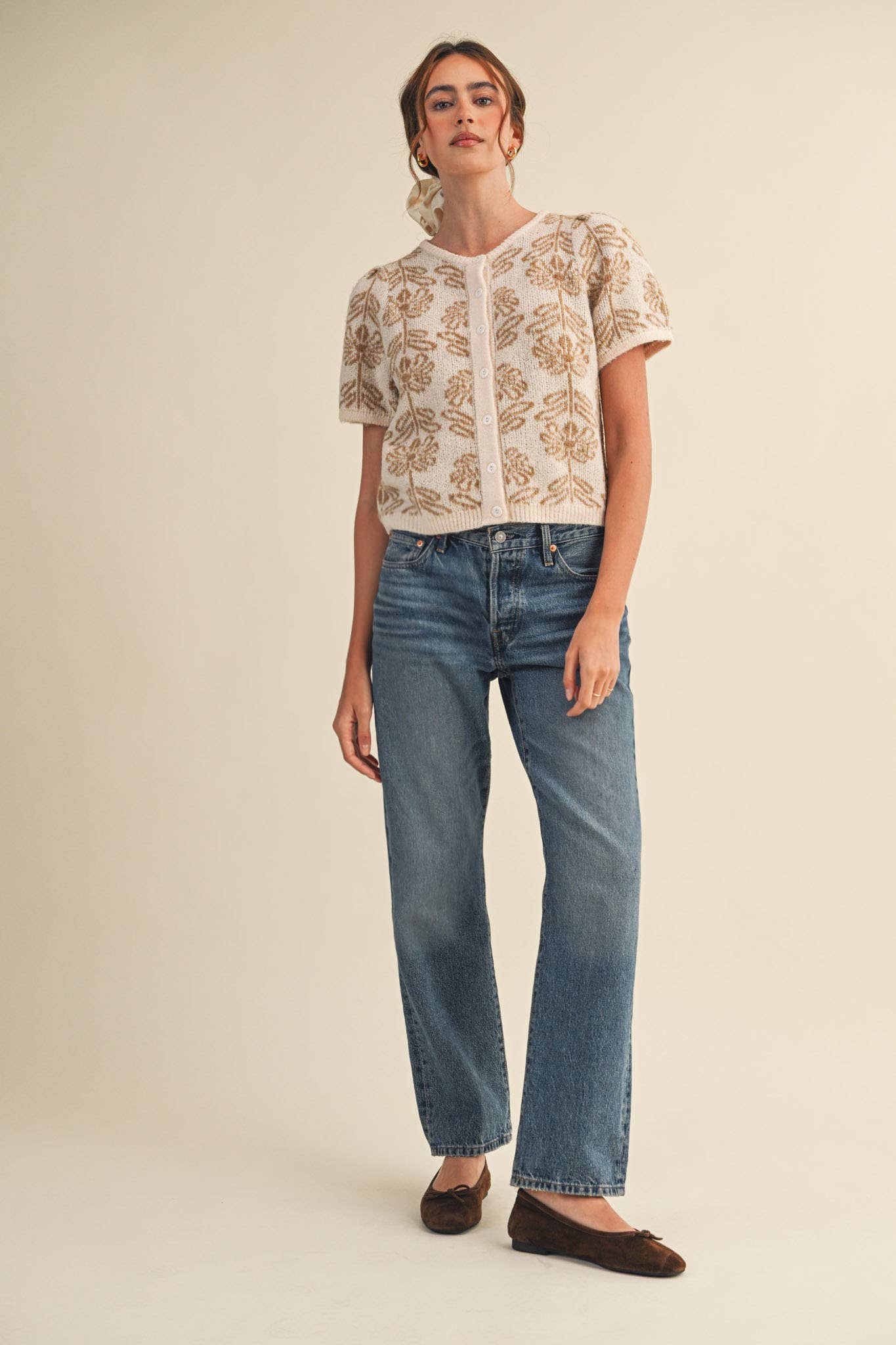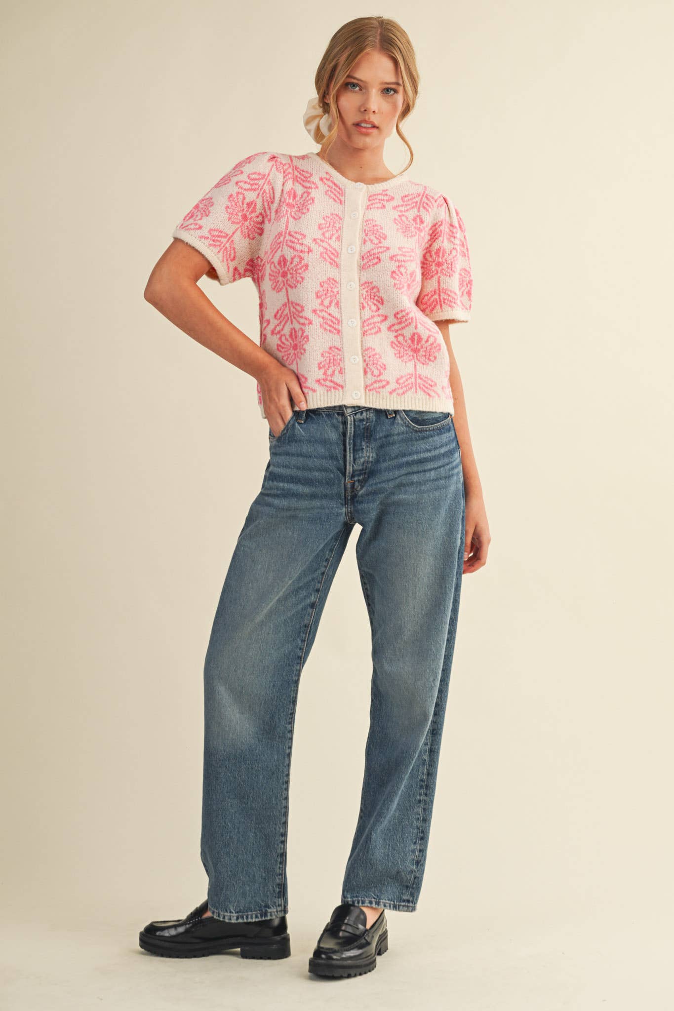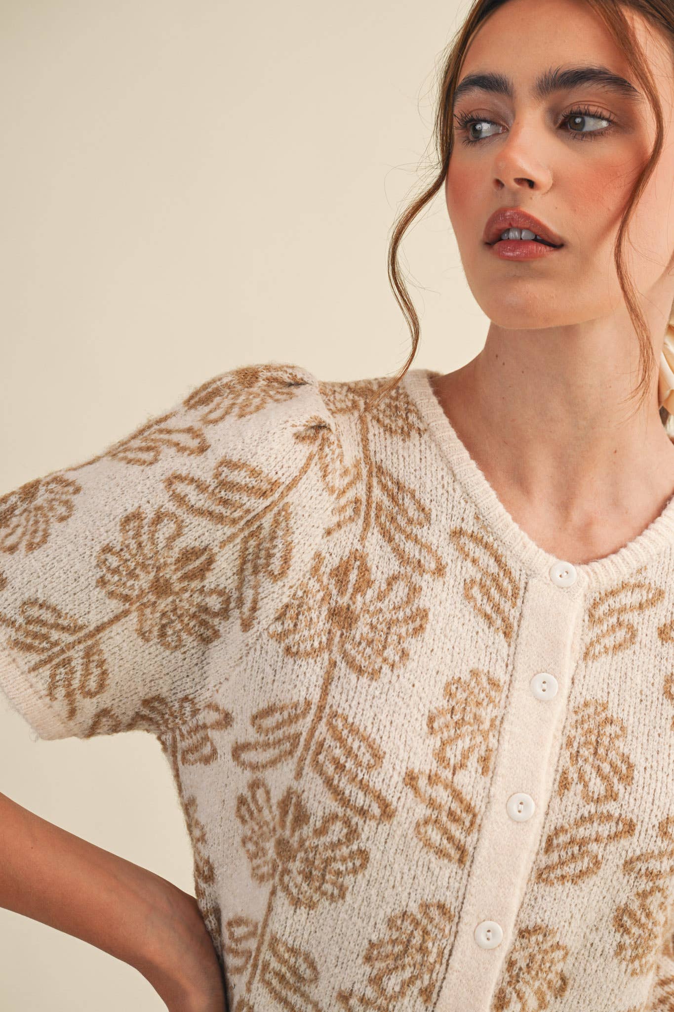 Elevate your everyday style with this charming floral knit cardigan that effortlessly combines comfort and sophistication. Featuring delicate all-over floral detailing, short puff sleeves add a playful touch while the relaxed fit ensures all-day wearability. The classic button-down placket and ribbed round neckline create a polished silhouette, while ribbed trim at the hem provides a refined finish. Perfect for layering over your favorite pieces, this versatile sweater cardigan transitions seamlessly from casual to dressed-up occasions. Model wears size S at 5'7.5" with 30-25-36 measurements.